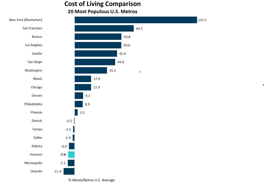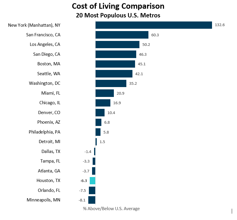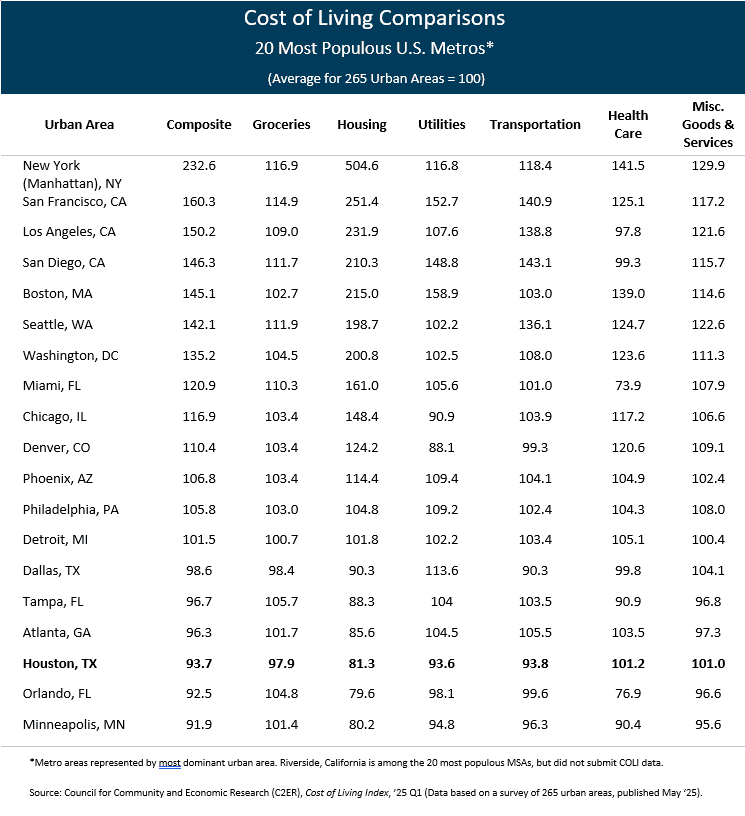 According to the C2ER Cost of Living Index 2025 Q3, Houston has the third-lowest living costs among the most populous U.S. metro areas. Houston’s living costs are 7.0 percent below the national urban average and 24.6 percent below the average of the nation’s most populous metropolitan areas.
