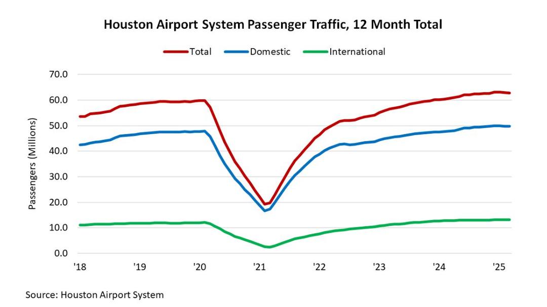 The Houston Airport System (HAS) handled 62.4 million passengers in the 12 months ending July ’25. That represents a 0.5 percent increase over the 62.1 million handled during the same period last year and a continued improvement over pre-pandemic levels of travel. Domestic and international travel accounted for 49.2 million and 13.2 million passengers, respectively.
