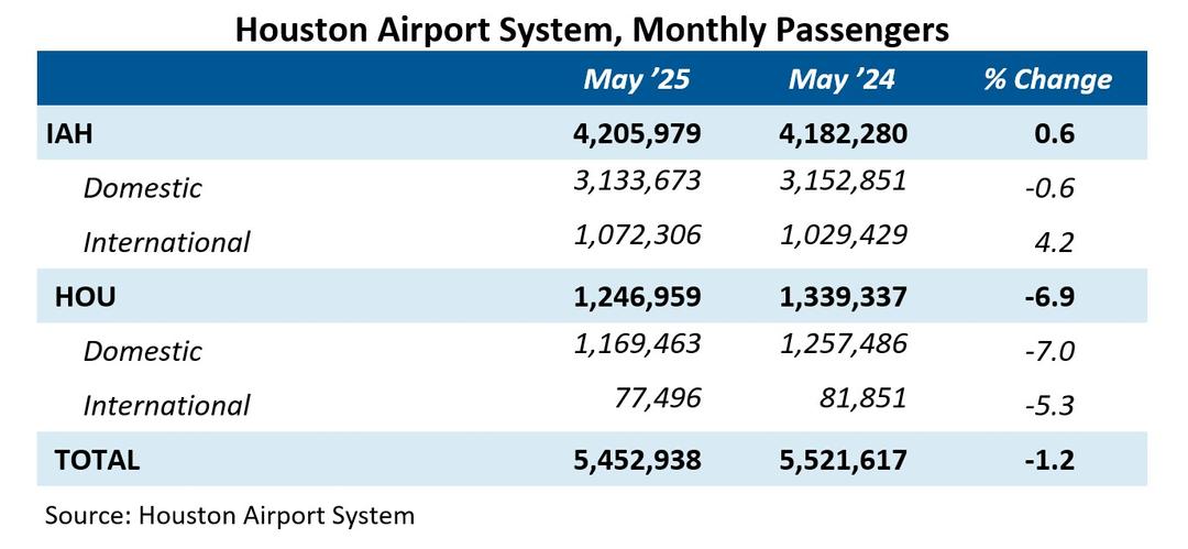 Travel was also up year over year for the month of July, growing 3.4 percent from July ‘24. Domestic travel was up 2.0 percent to 4.5 million passengers while international travel increased 8.0 percent to 1.4 million. The total number of passengers increased at both the William P. Hobby Airport (HOU) and the George Bush Intercontinental Airport (IAH), by 1.4 and 4.0 percent respectively.
